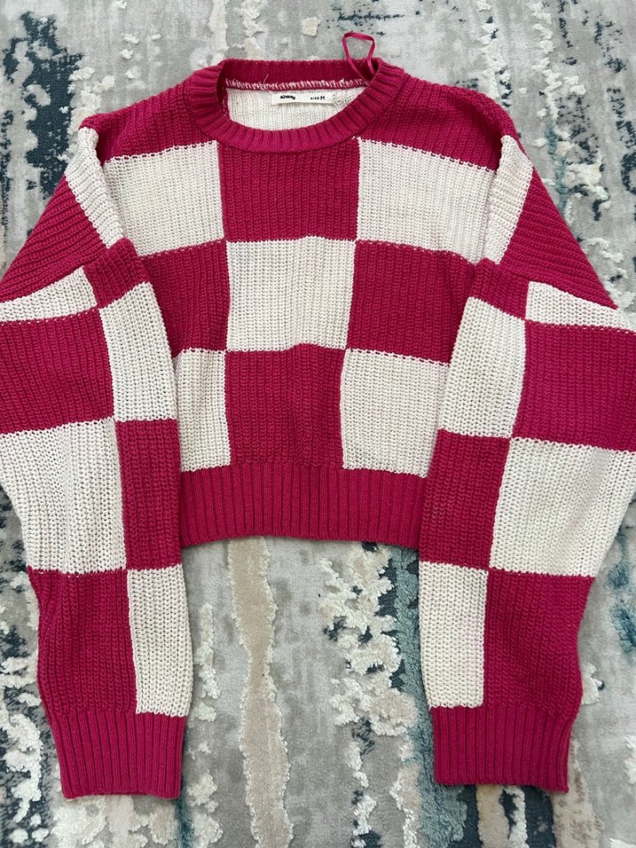 Pembe ve krem ekose desenli örgü kazak, uzun kollu ve yuvarlak yakalı, rahat kesimiyle günlük sokak stili için uygundur.