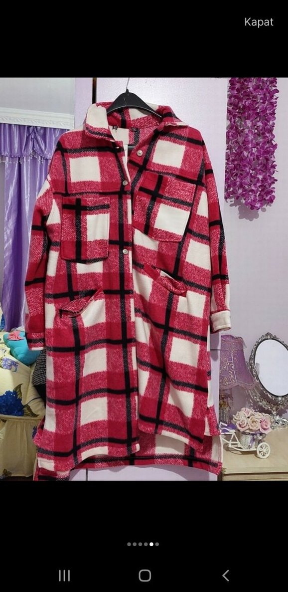 Renkli pembe ekose desenli, düğmeli, uzun ve bol kesim kadın gömlek. Yumuşak ve sıcak kumaştan, yakalı ve uzun kollu, rahat sokak stili için uygun.