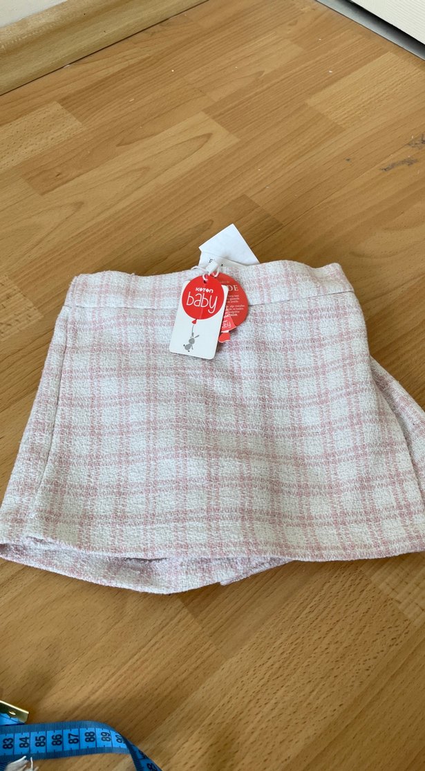 Pembe ekose desenli, örgü dokulu sentetik kumaştan yapılmış, bol kesim kısa mini etek. Rahat ve günlük sokak giyimi için uygundur.