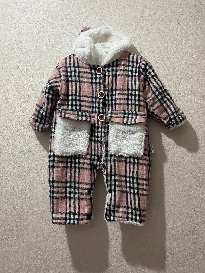 Pastel pembe ekoseli, kürk detaylı, kesik yaka ve cepli bebek kız tulumu. Yumuşak ve sıcak kumaş ile rahatlık sağlar. ❄️