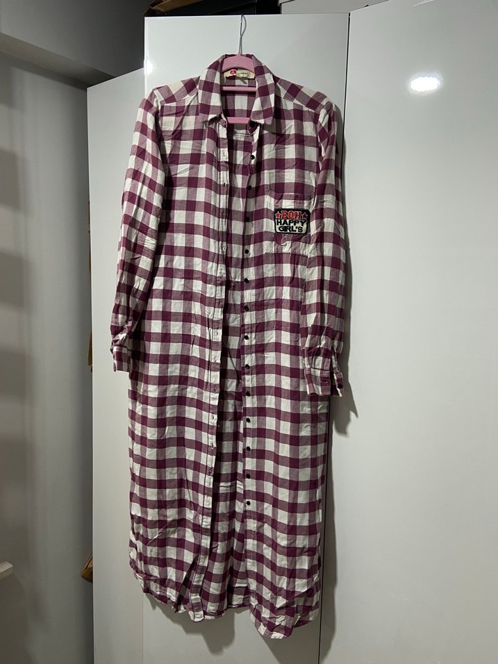 Pembe Ekoseli Kadın Uzun Salaş Gömlek Elbise