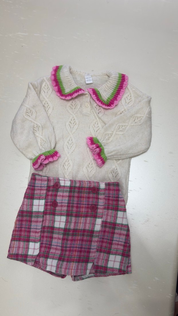 Krem rengi örgü uzun kollu üst, renkli fırfırlı yaka ve manşetlerle, pembe ekoseli şort ile tamamlanmıştır. Pastel tonlarda şık bir bebek takımı.