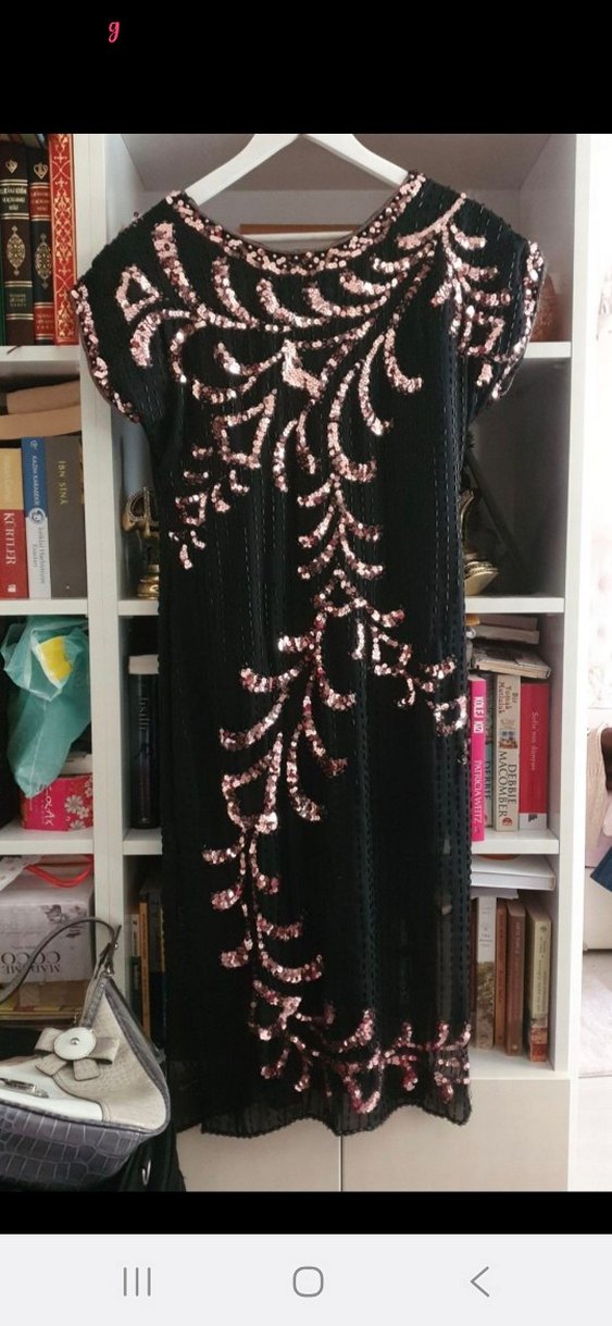 Koyu renkli, pembe işlemeli desenlere sahip, kısa kollu ve V yakalı vintage tarzda uzun, oturan abiye elbise. Parti için uygun. birkaç yerinde boncuk atmış