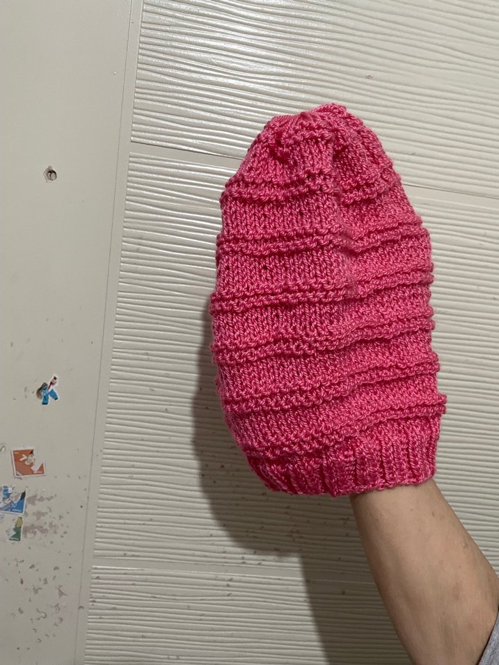 Renkli pembe bere, yumuşak örgü kumaştan üretilmiş olup, rahat ve sade bir tarz sunar.
