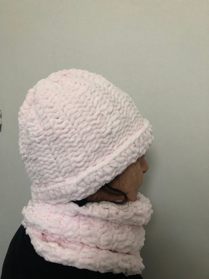 Yumuşak, pembe el örgü bere ve uyumlu boyunluk seti, sade ve yumuşacık tasarıma sahip.