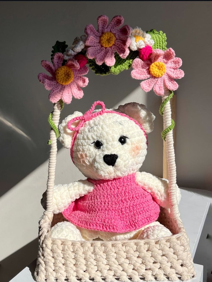 Pembe el örgüsü elbise giymiş yumuşak peluş ayıcık, renkli çiçeklerle süslenmiş sepette oturuyor. El yapımı sevimli bir peluş oyuncak.