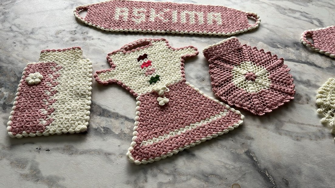 Pastel pembe renkte, el örgüsü tasarıma sahip yumuşak dokulu banyo lif seti. Ürün belirtin lütfen adet fiyatı 100 liradır