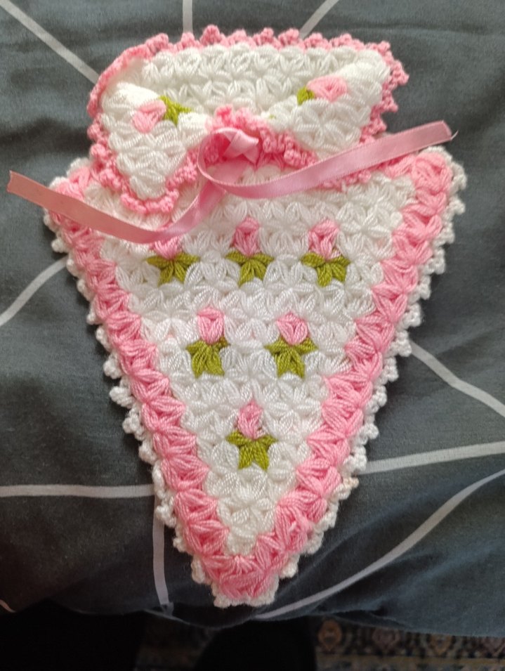 Pastel pembe ve beyaz renklerde, çiçek desenli el örgüsü banyo süngeri, yumuşak dokusuyla nazik temizlik sağlar.