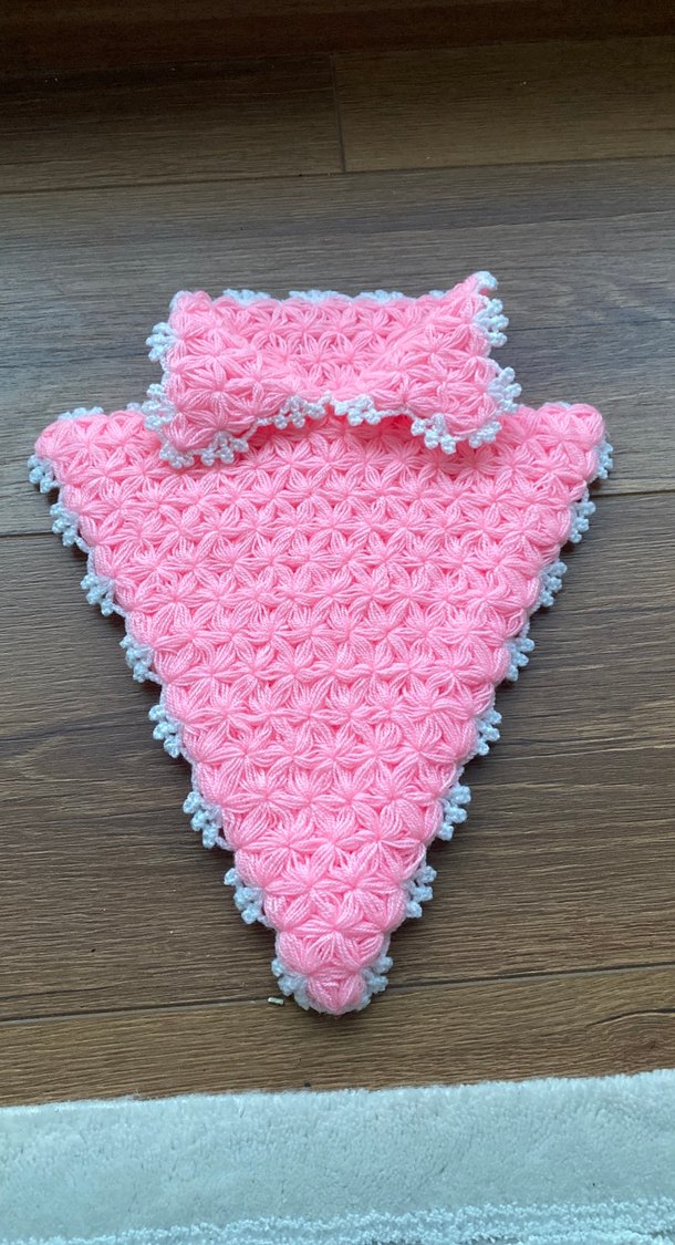Pastel pembe renkli, dokulu desene ve beyaz kenarlığa sahip el örgüsü banyo lifi nazik temizlik için uygundur. Elde örüldü