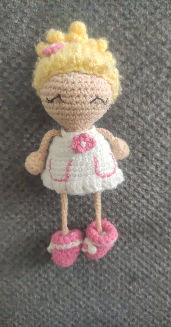 Pastel pembe terlikleri ve pembe çiçekli beyaz elbisesi olan Amigurumi el örgüsü bebek. Yumuşak dokulu, kapalı gözleri var. sallanabilen oturabilen bebek. oyuncak Biblo,çanta süsü ve anahtarlık olarak kullanılabimektedir .farklı renkerde sipariş alınır .15-17 cm arasi