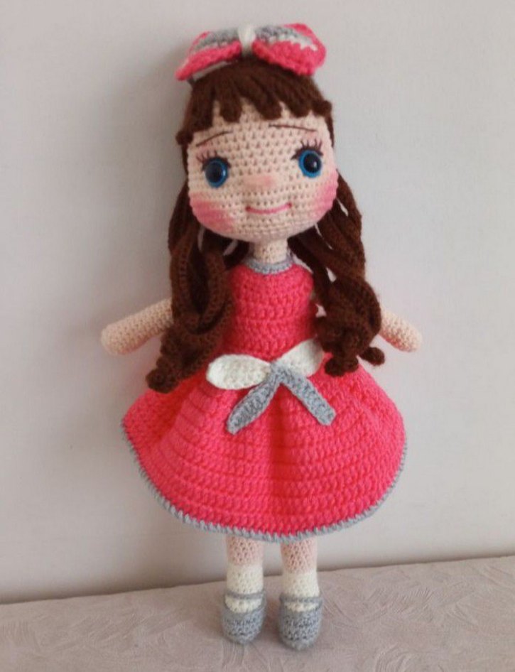 Pembe el örgüsü elbise ve fiyonkla, kahverengi saçlı ve mavi gözlü el yapımı bebek. Yumuşak ve renkli tasarım.