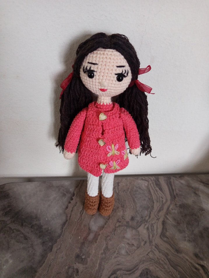 Uzun koyu saçlı, düğme ve nakışlı pembe kaban giymiş, beyaz tayt ve kahverengi botlu el örgüsü bebek. Bebek tek parça örülmüştür boyu 28 cm yeni örüldü görseli satın alabilirsiniz hemen kargolama yapılır koton ip kullanildi boyu 28 cm