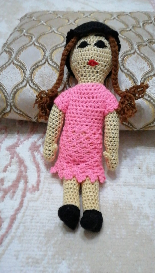 Pembe el örgüsü elbiseye sahip, kahverengi örgülü saçlı, siyah ayakkabılı ve yüz detayları bulunan el yapımı bebek.