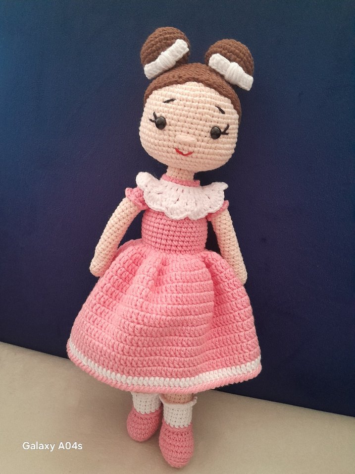 Kahverengi topuz saçlı, beyaz detaylı pembe el örgüsü bebek.