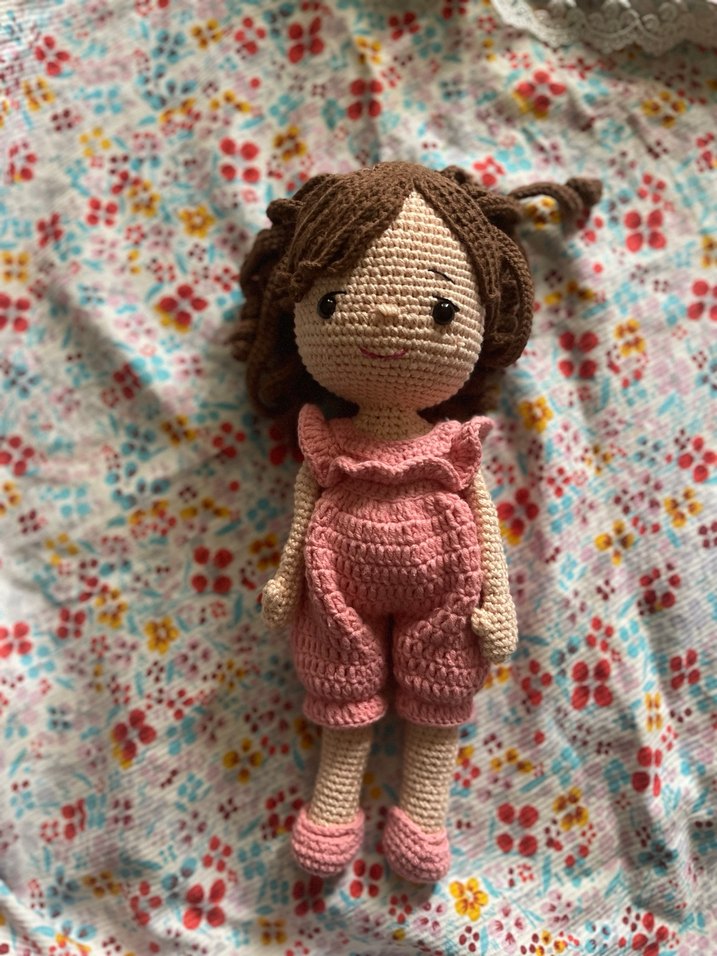 Kahverengi saçlı, pastel pembe el örgüsü bebek, detaylı dikişli ve yumuşak dokulu.