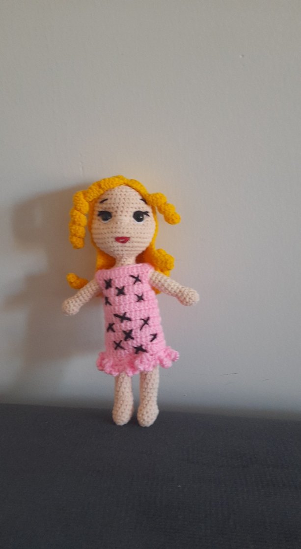 Sarı saçlı ve pembe elbisesi olan renkli el örgüsü bebek. Yumuşak ve el yapımı sevimli bir oyuncak.