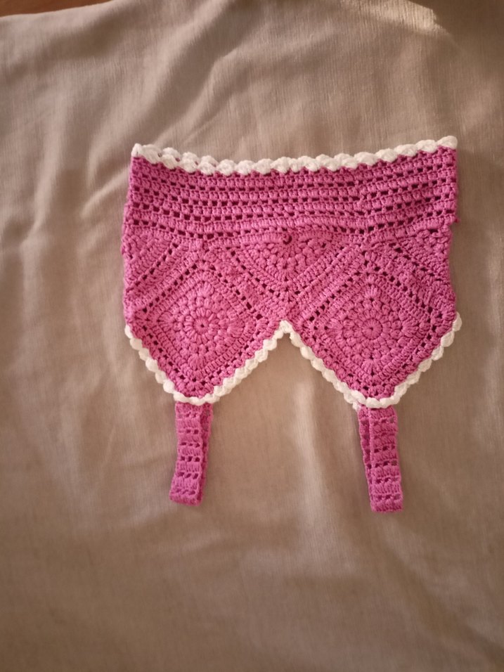 Pembe renkli, beyaz kenar detaylı el örgüsü bebek önlüğü, yumuşak ve şık bir aksesuar sunar.
