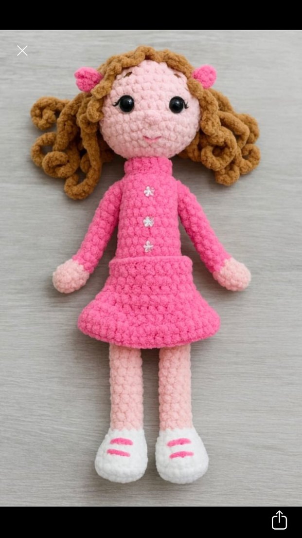 Renkli detaylara sahip, kıvırcık saçlı ve pembe elbise giymiş yumuşak el örgüsü bebek oyuncak.