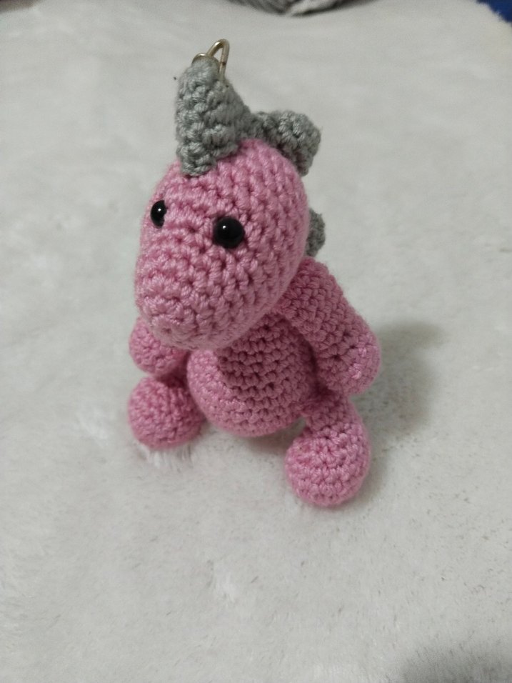 Siyah gözlü, gri dikenli pembe el örgüsü dinozor peluş oyuncak, yumuşak ve renkli.