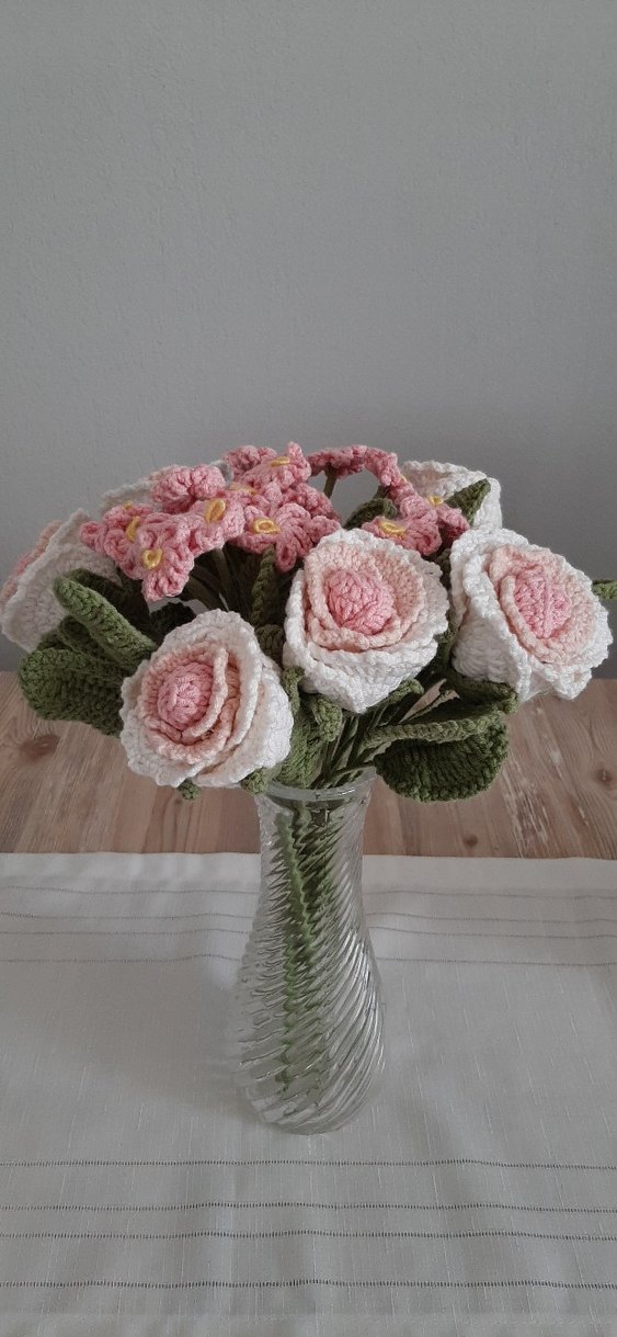 Pastel pembe renkte el örgüsü çiçekler, yeşil yapraklarla birlikte şeffaf cam vazoda düzenlenmiştir. Zarif ve hoş bir ev dekorasyon ürünü.