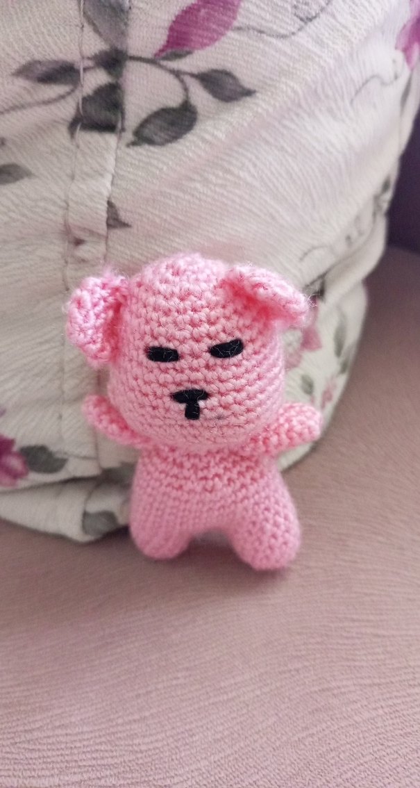 Pastel pembe renkte, yumuşak iplikle el örgüsü yapılmış küçük peluş oyuncak ayıcık. Siyah işleme göz ve burun detayları bulunur.