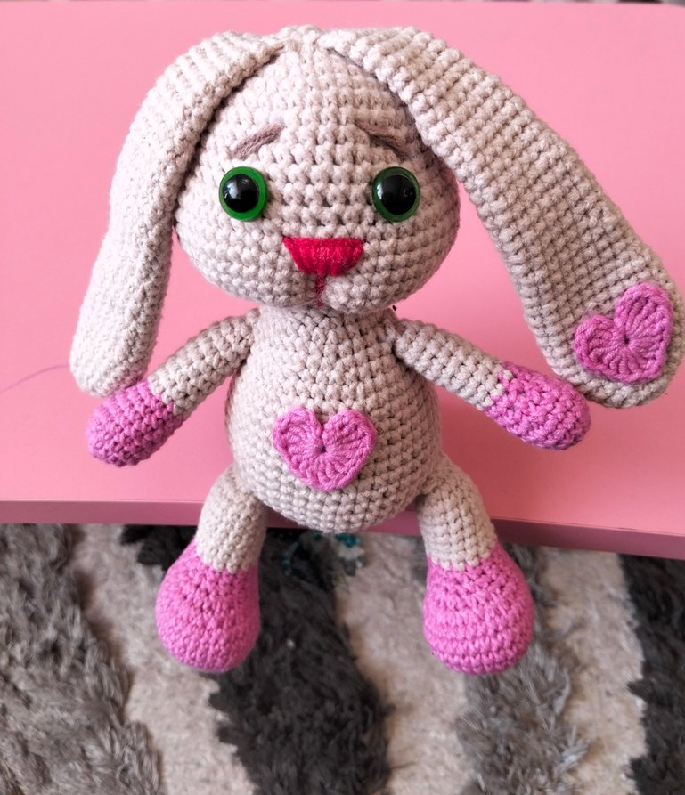 Büyük yeşil gözlü, pembe kalp detaylı, yumuşak pastel pembe el örgüsü ,tamamen doğal tavşan .