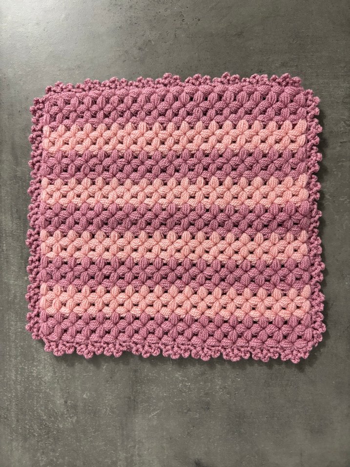Pastel pembe renkte, el yapımı örgü dokusuyla yumuşak ve nazik bir banyo süngeri.