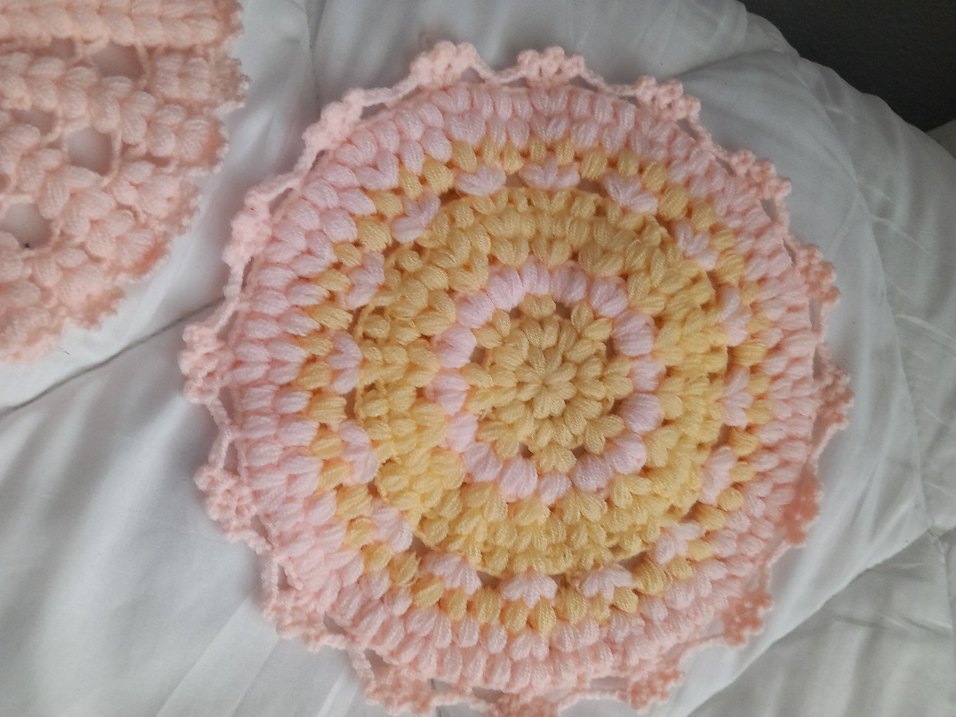 Yumuşak pastel pembe renkte, el yapımı ve zarif tığ işi desenli banyo süngeri.