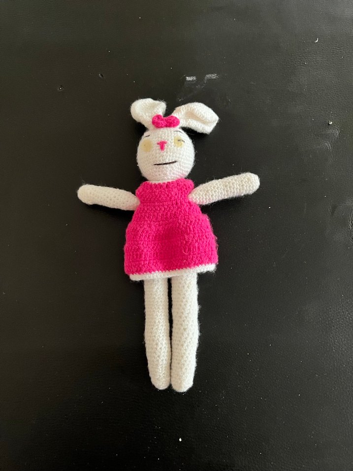 El yapımı örgü oyuncak bebek, pembe elbise ve beyaz vücuda sahip tavşan şeklindedir, uzun kulaklar ve basit yüz detayları bulunur.