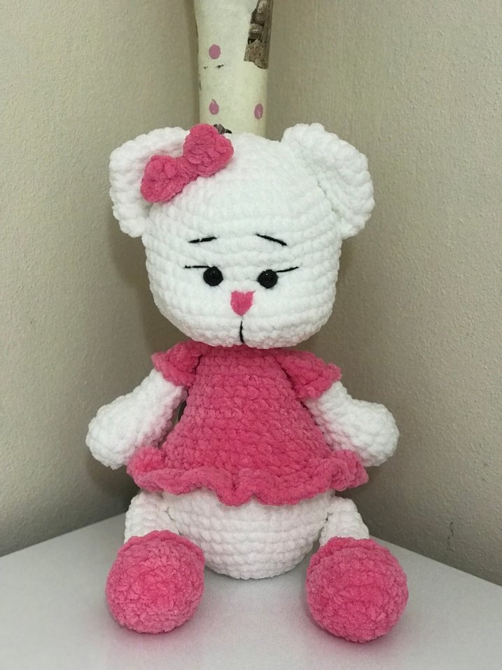 Yumuşak dokulu, pembe el yapımı peluş ayıcık, fiyonk ve elbise detaylı. Kendim örüyorum.
