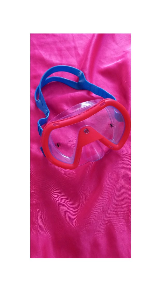 Elastik bantlı, pembe çerçeveli ve renkli tie-dye desenli yüzücü gözlüğü. Plajda kullanıma uygun, minimalist ve avangart tarzda.