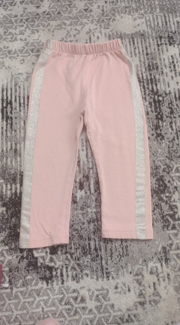 Pembe tonlarında, elastik belli, yanları parlak çizgili, sentetik yumuşak kumaştan yapılmış, dar kesim kız taytı. birinde leke var çıkabilir üçlü fiyat uygun yazdim