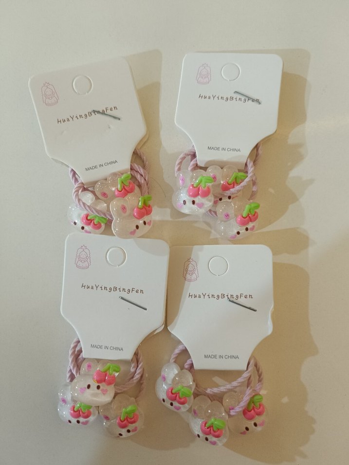 Pembe elastik ve pastel renkli desenlere sahip, kiraz ve ayı figürlü çocuk saç tokası. Retro ve bohem tarzlar için uygun.
