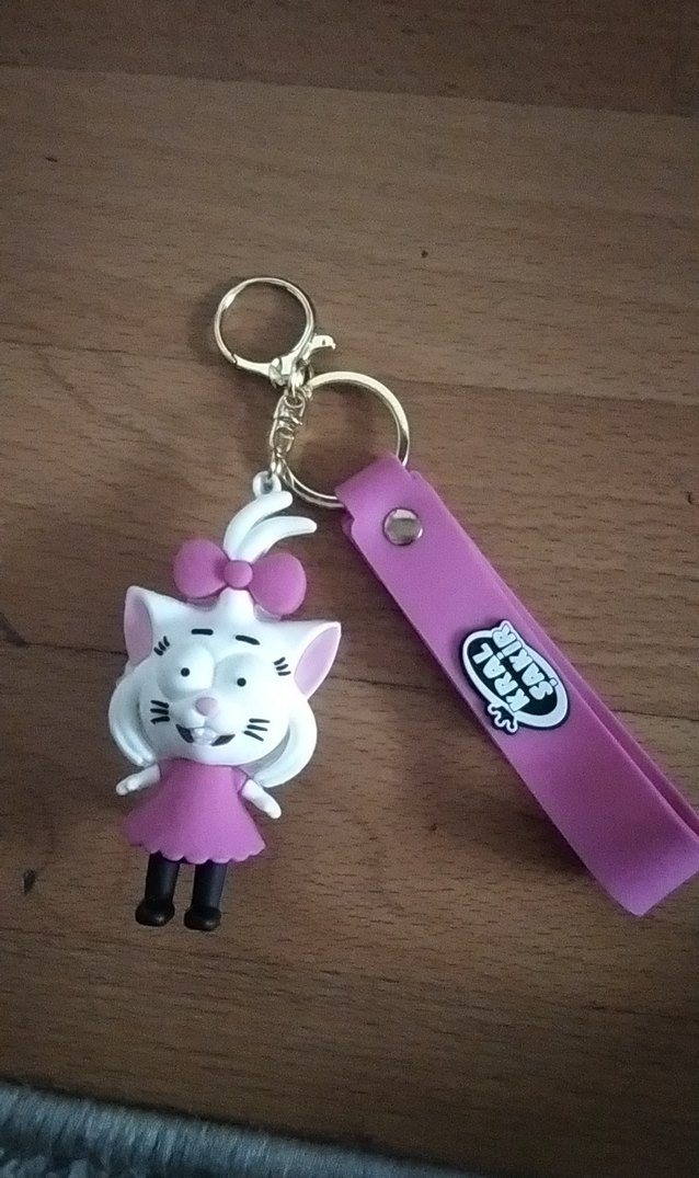 Pembe elastik bantlı, renkli kedi figürlü, sokak modası tarzında kadın anahtarlık. Rock punk ve minimalist ruhu yansıtıyor.