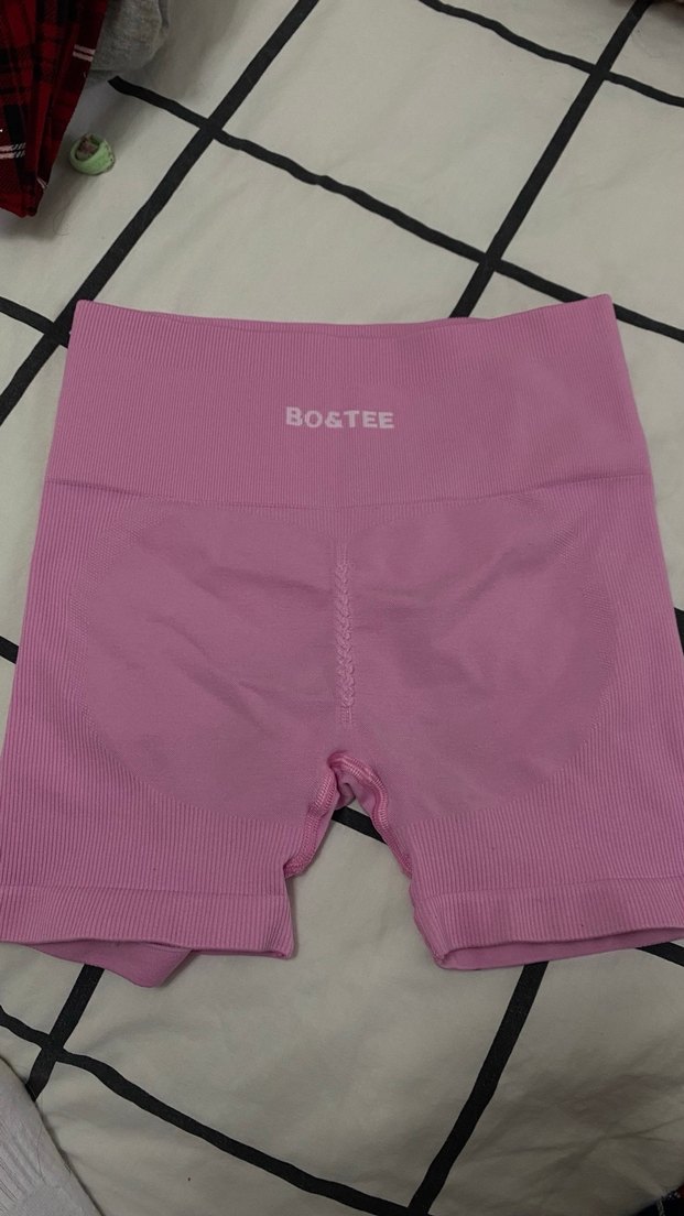 Elastik sentetik kumaştan yapılmış, BO&TEE logolu pembe mini tayt. Spor ve sokak stili için uygun, pastel tonlarda.