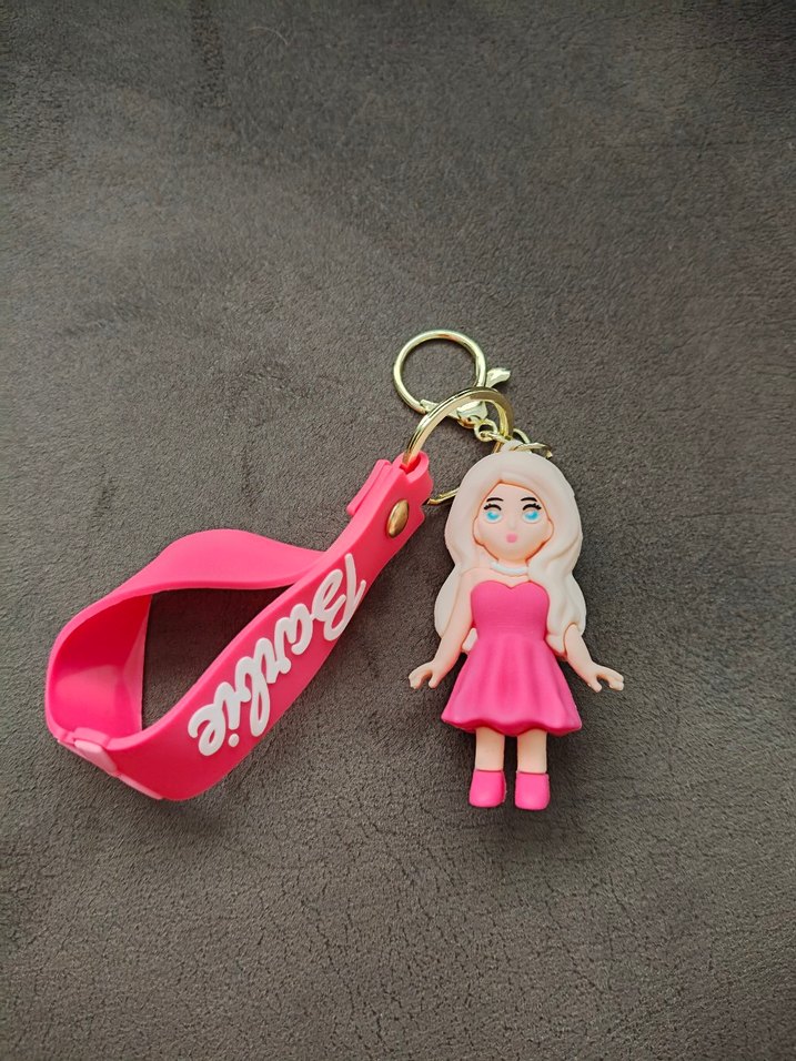 Pembe elastik bant ve küçük bebek figürlü, 'Farbie' marka anahtarlık. Cesur, minimalist streetwear tarzına uygundur.