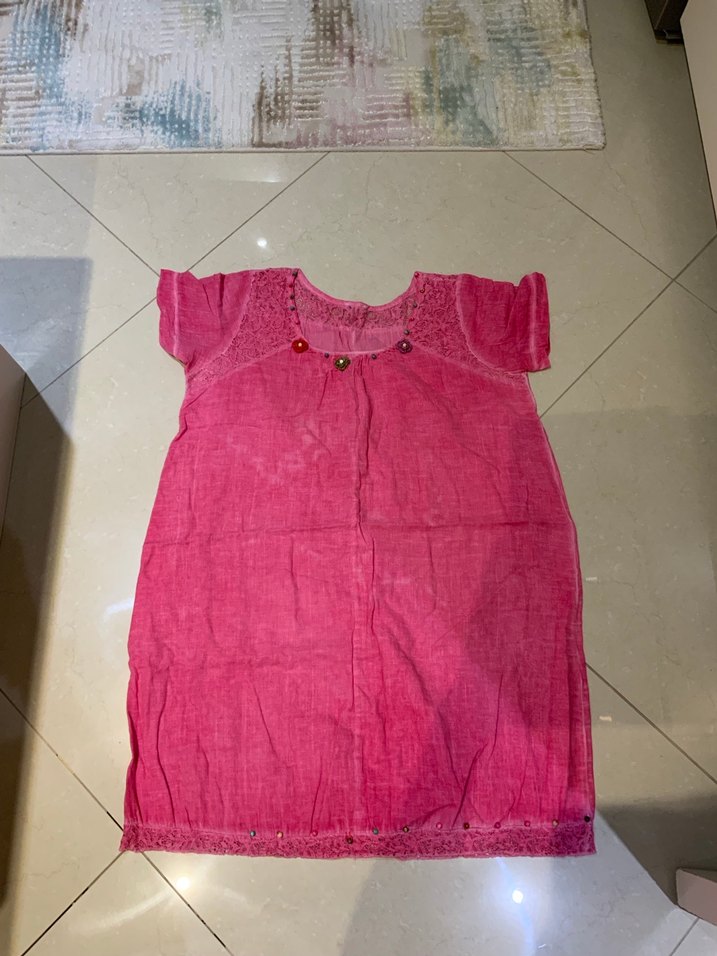 Pembe boncuk detaylı elbise, 42-44 beden uyumlu, arka tarafında küçük dikişi açılmıştır onun dışında hiçbir sorunu yoktur. Ölçüleri; eni:55cm, boy:85 cm