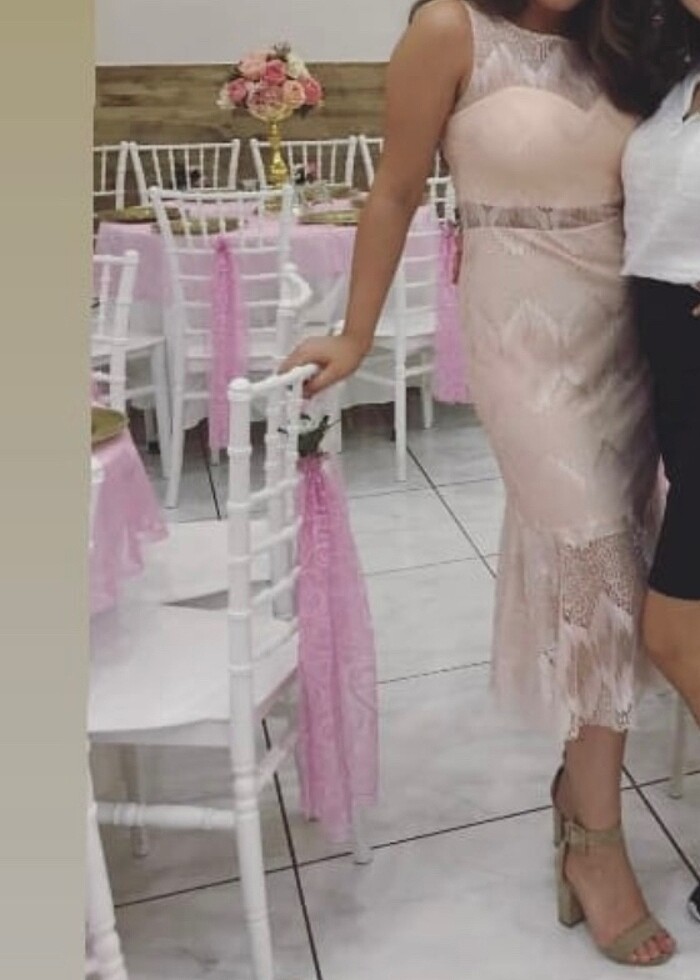 Pembe kalem elbise dantel detaylı dekolte detaylı etek kısmı fırfırlı bir elbisedir bir kere giyilmiştir hiç bir sorunu yoktur