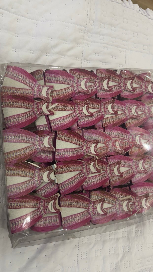 Işıltılı desenlere sahip açık pembe elbise şeklinde kına gecelerinde dagıtmalık süs