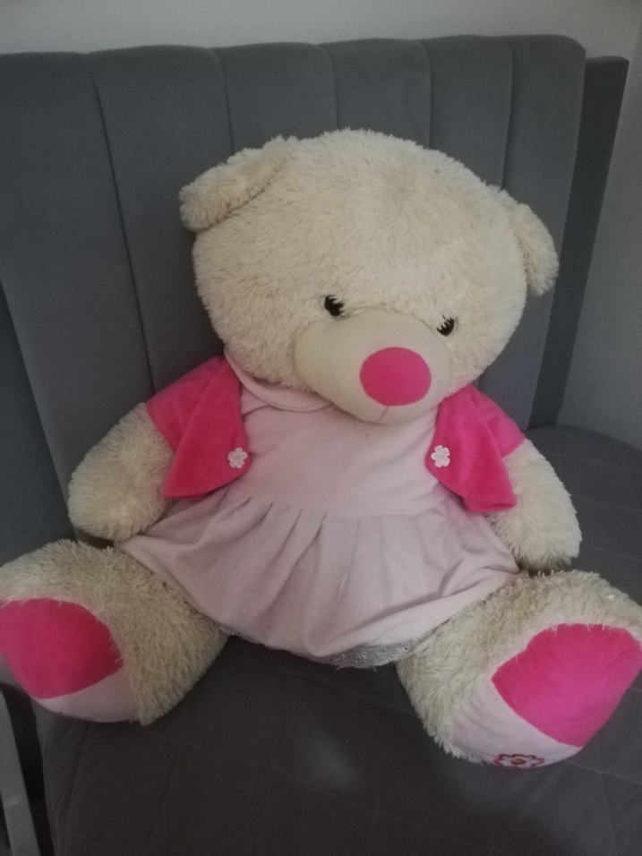 Yumuşak peluş malzemeden yapılmış, pastel pembe elbise ve canlı pembe ceket giymiş oyuncak ayı. Büyük boy ortalama 80cm civarı metre yok tam ölçemedim . Burnu ve ayakları pembe detaylı. İyi durumda yırtığı söküğü yok. Adını dudu koymuştuk :) :)