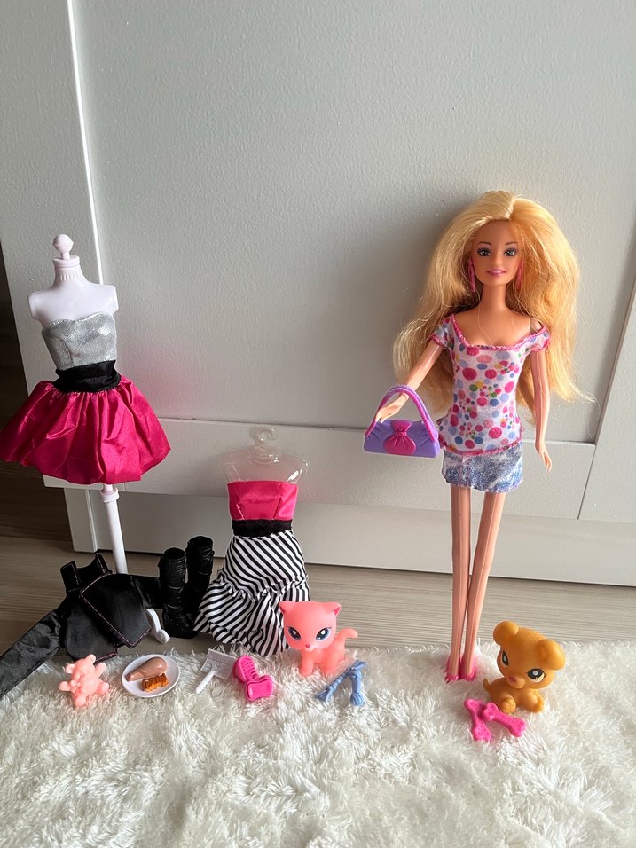 Renkli üst ve kot etek giymiş bebek, pembe çanta, çeşitli evcil hayvan figürleri ve pembe etekli manken dahil aksesuar seti.