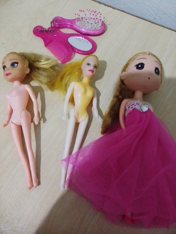 Sarı saçlı üç bebek, biri pastel pembe elbiseli, yanında pembe saç fırçası ve tarak aksesuarlarıyla birlikte.hepsinin fiyatı