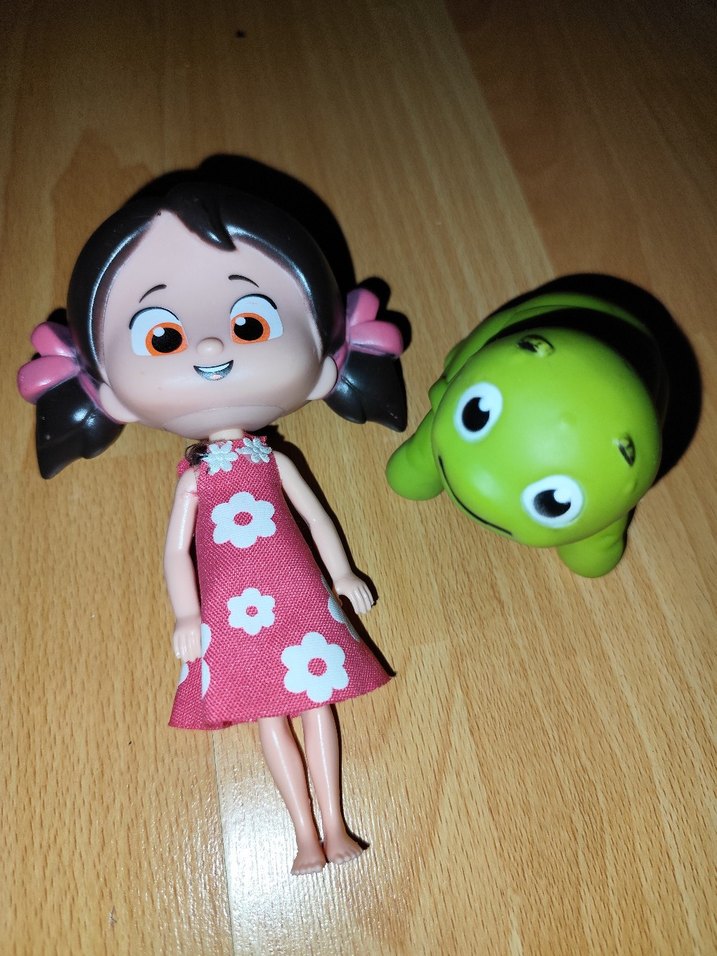 Pembe elbiseli, beyaz çiçek desenli renkli bir kız bebeği ve yanında küçük yeşil kaplumbağa oyuncağı. İkisi de neşeli ifadeye sahip.