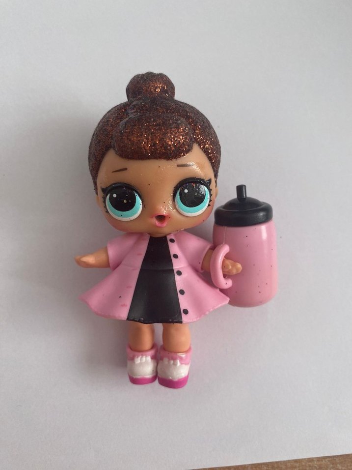 Minik bebek pembe elbise ve siyah detaylarla, elinde pembe bir şişe tutuyor. Büyük mavi gözleri ve topuz saç modeli var.