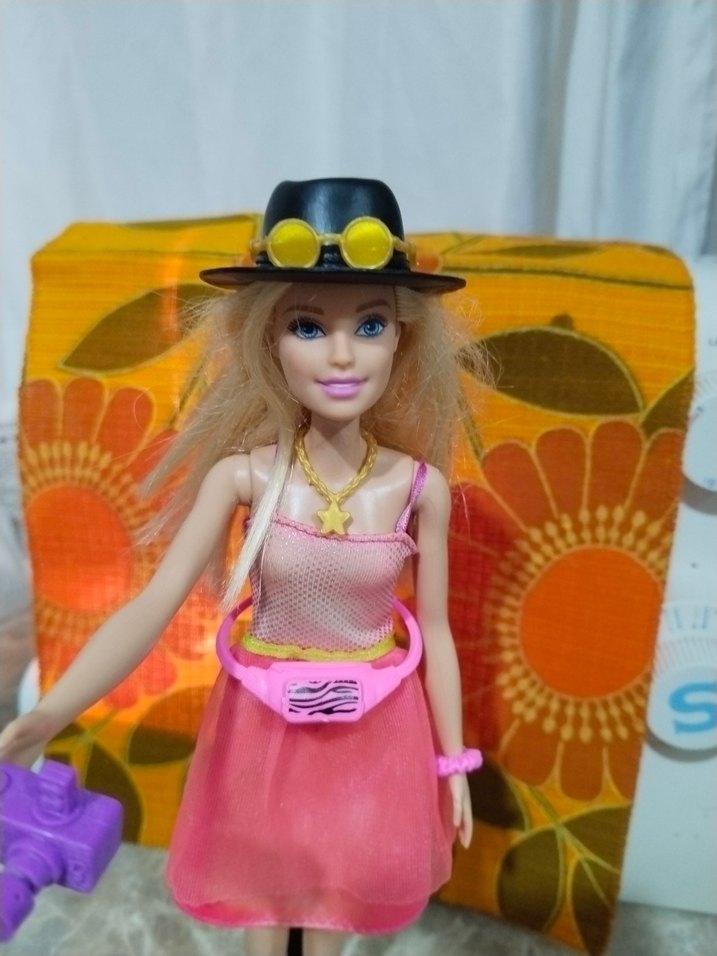 Renkli bebek, pembe elbise ve sarı gözlüklü siyah şapka ile. Pembe kemer çantası ve yıldız kolye içerir. Oyun için uygun.
