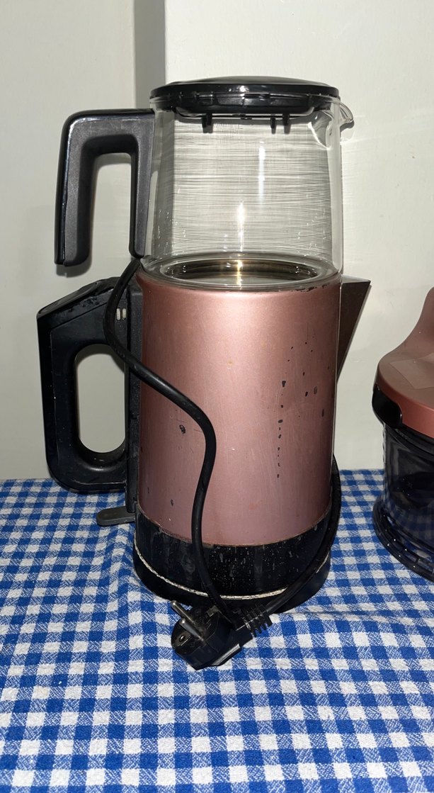 Koyu pembe tabanlı, plastik demliği ve siyah sapıyla elektrikli çay makinesi. Güç kablosu ile kullanıma hazırdır.ürünün çalışmasında herhangi bir sorun yoktur