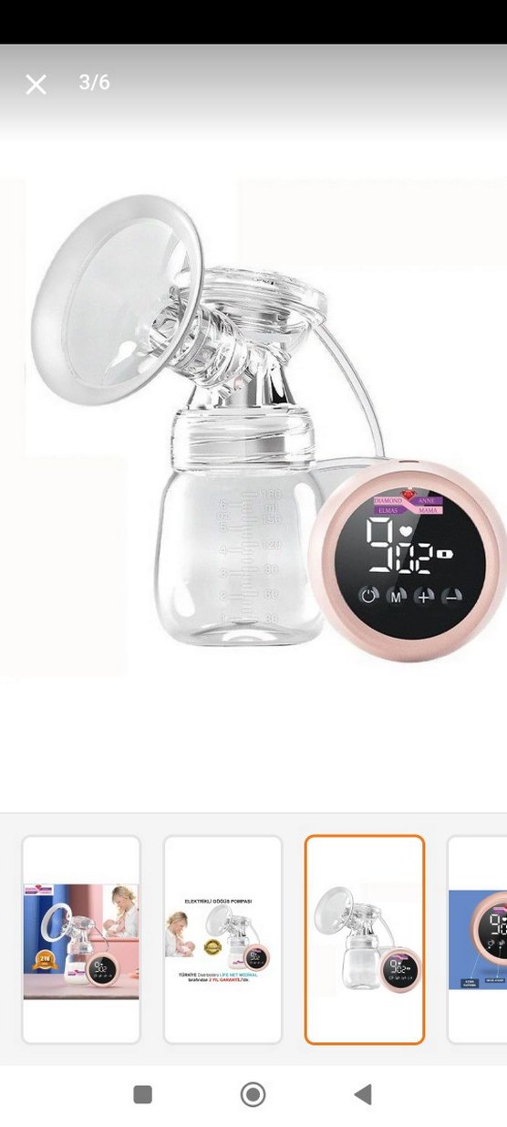 Dijital ekrana sahip pembe elektrikli göğüs pompası, rahat kullanım için yumuşak silikon parçalar içerir. Ölçü işaretli biberon dahildir.