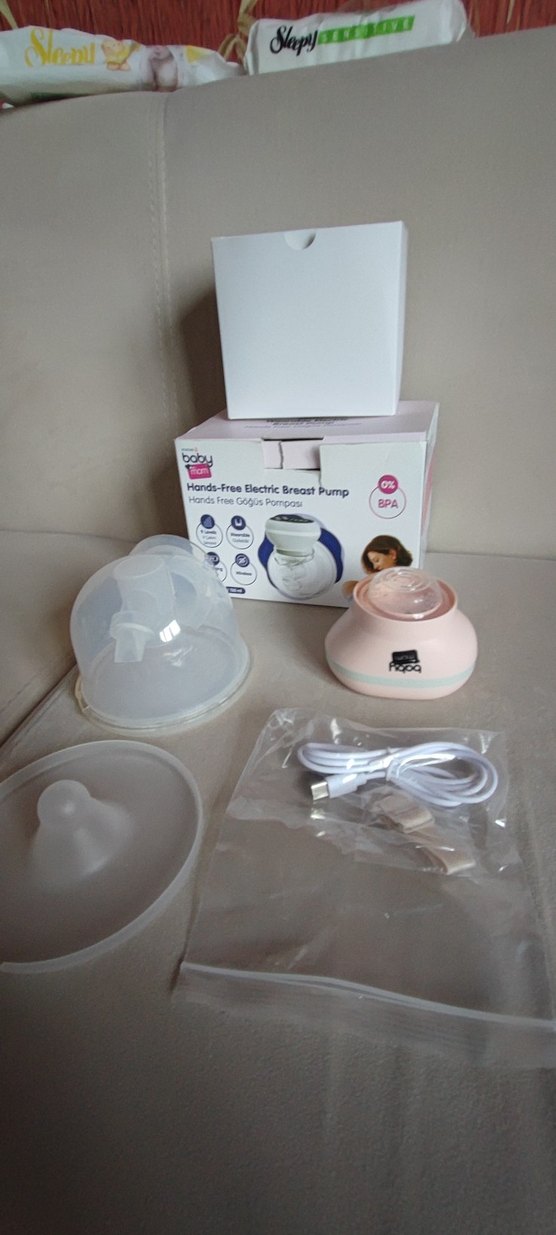 Pembe renkli elektrikli göğüs pompası, eller serbest kullanım sağlar. Koruyucu kapak, USB kablosu ve yumuşak silikon göğüs aparatı ile birlikte gelir. BPA içermez.