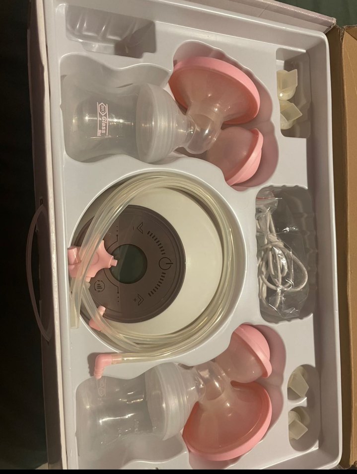 Çift vakumlu, pembe renkli elektrikli göğüs pompası seti, hortum ve USB kablosu ile birlikte gelir.
