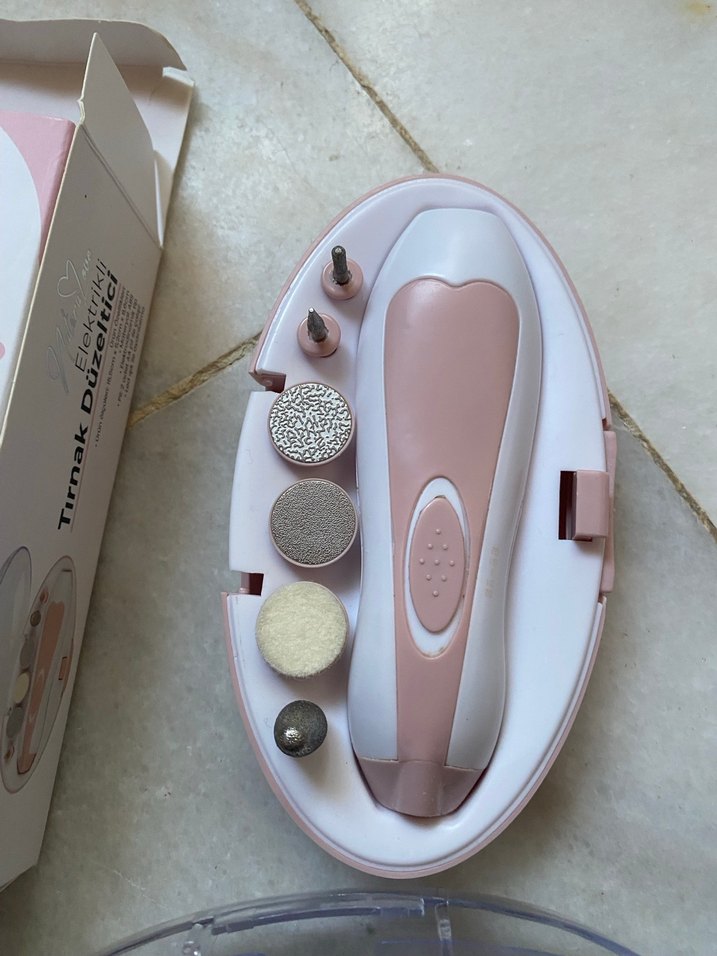 Pembe elektrikli tırnak düzeltici set, tırnak törpüleme, parlatma ve cilalama için farklı başlıklar içerir. Kompakt kutusunda saklanabilir.